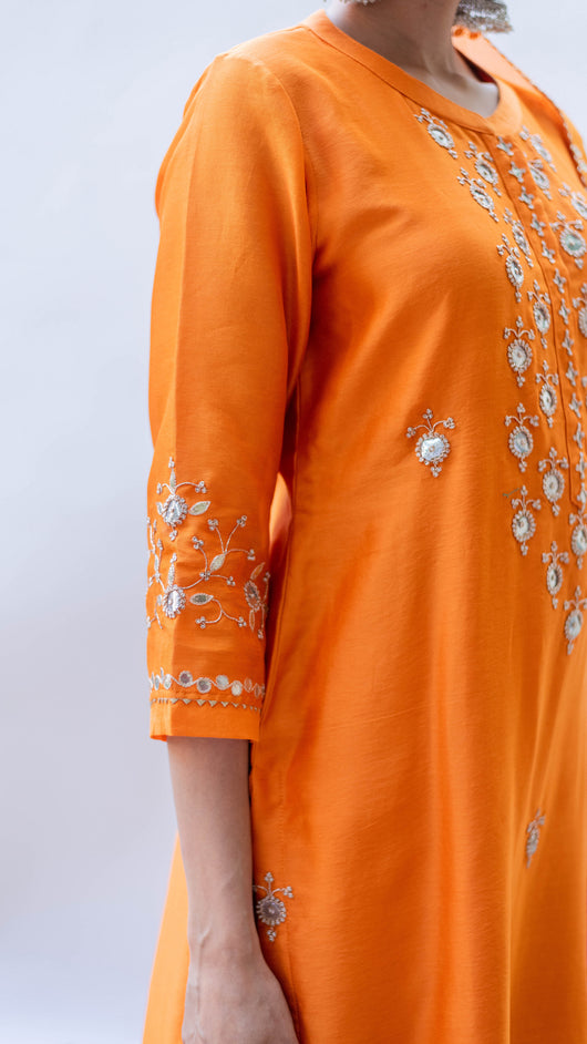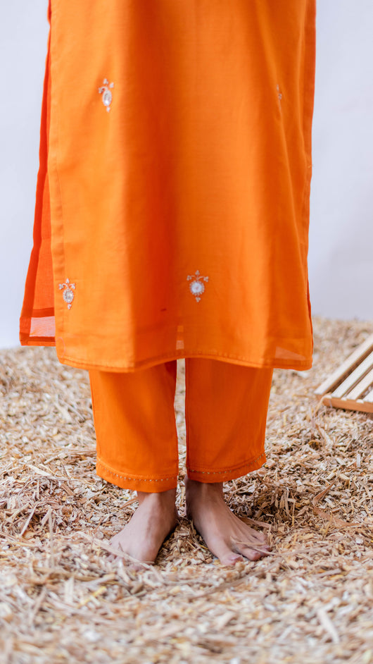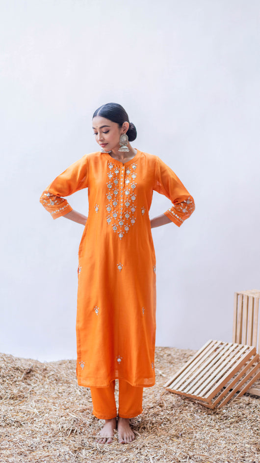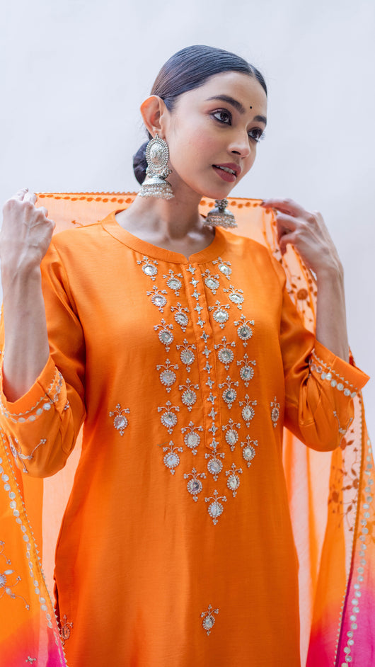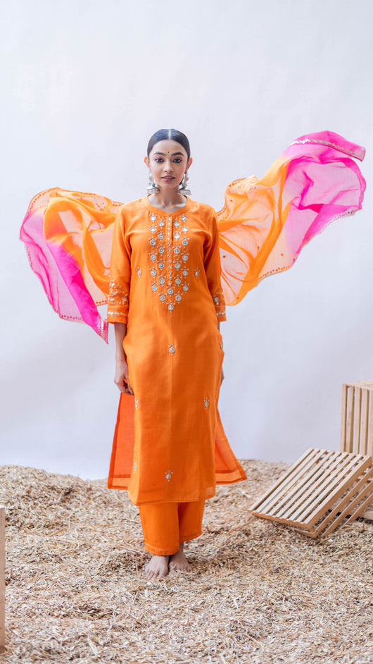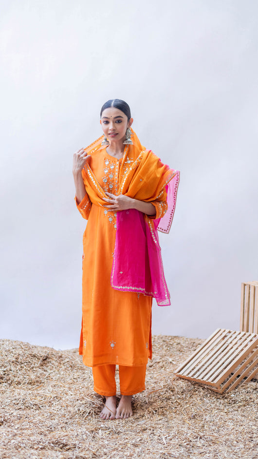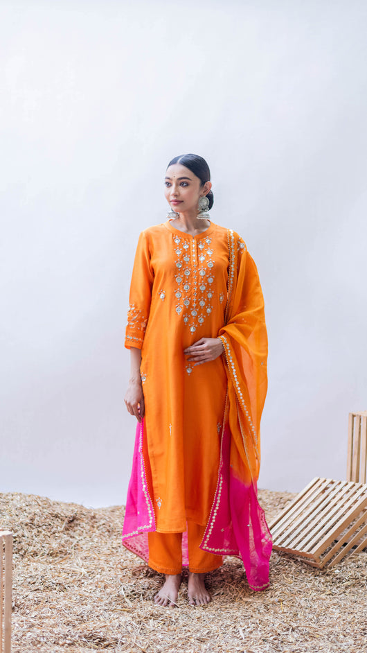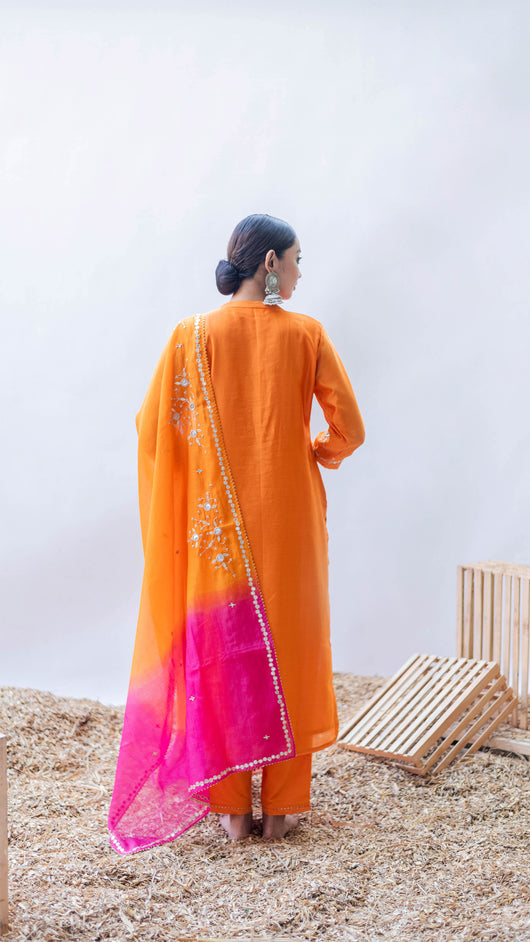 Our Gulmina Kurta set features intricate hand embroidery on the kurta. The attire is completed with a detailed ombre dupatta and matching straight pants.