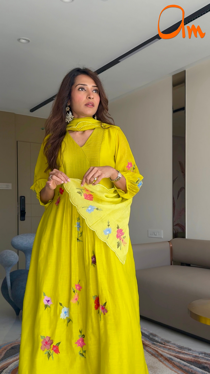 Our Zooni tunic set features multi-hued floral cord embroidery. The attire is completed with an ombre scarf and straight pants.
